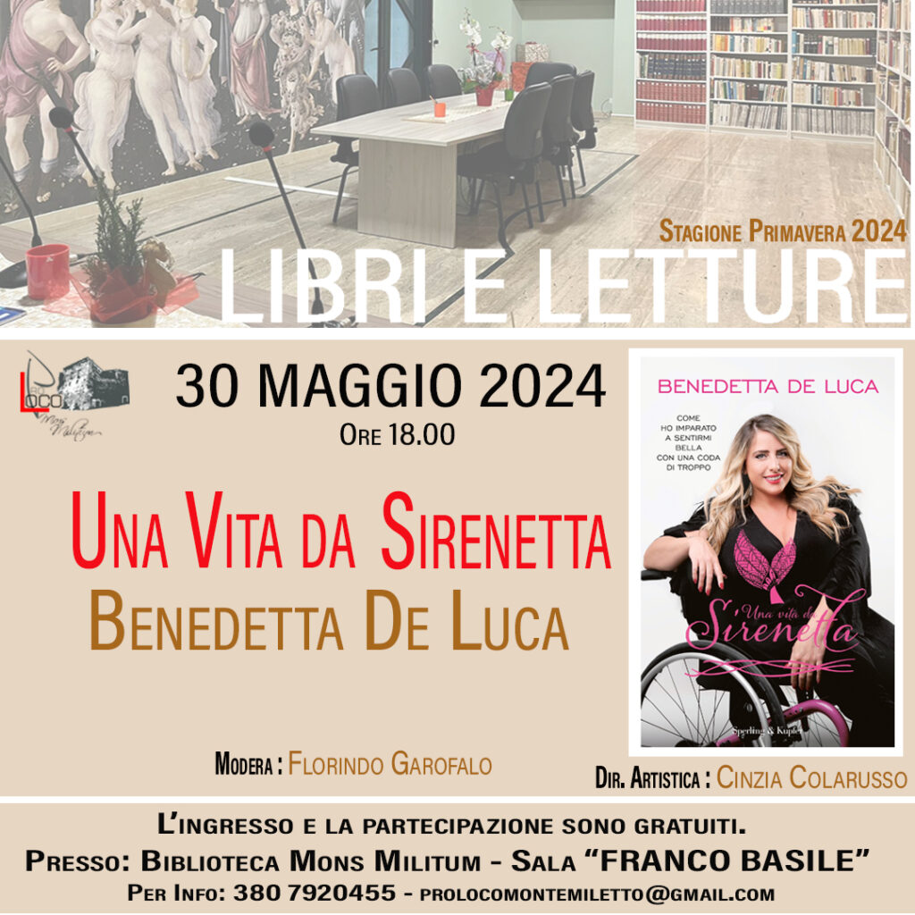 15° appuntamento con “Libri e Letture” alla Biblioteca “Mons Militum” di Montemiletto – Sala “Franco Basile”. Protagonista dell’iniziativa in programma quest’oggi alle ore 18 il volume “Una Vita Da Sirenetta” di Benedetta De Luca.