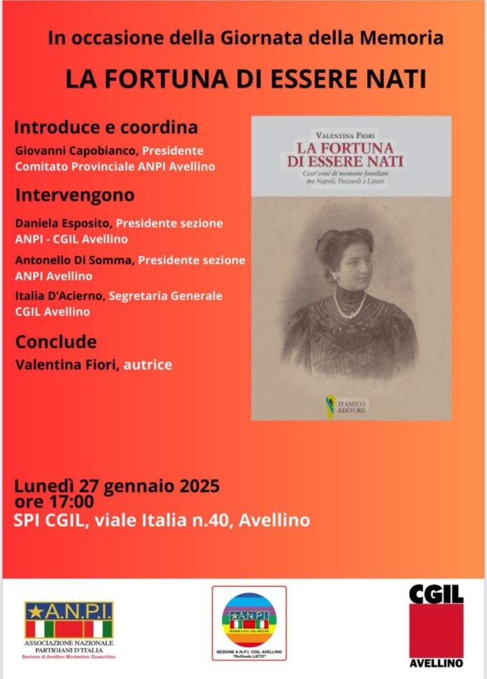 Per la presentazione di “L’importanza di essere nati” saranno presenti: Giovanni Capobianco, Presidente, Comitato Provinciale ANPI Avellino che introdurrà e coordinerà l’evento; Con Daniela Esposito, Presidente sezione ANPI – CGIL Avellino Antonello Di Somma, Presidente sezione ANPI Avellino Italia D’Acierno, Segretaria Generale CGIL Avellino Con le Conclusioni affidate all’autrice Valentina Fiori.