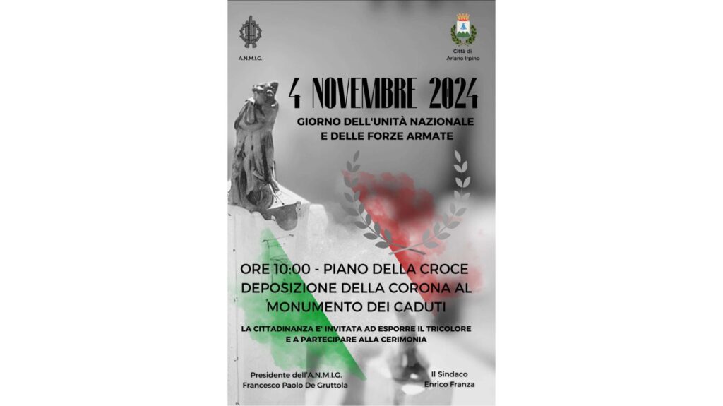 L’Amministrazione Comunale di Ariano Irpino, in una sobria e solenne cerimonia, vuole commemorare i Caduti di tutte le Guerre, rendere omaggio alle Forze Armate, celebrando la Festa dell’Unità Nazionale, in ricordo della fine della prima Guerra Mondiale. Appuntamento lunedì 4 novembre 2024 alle ore 10,00 al Piano della Croce presso il Monumento ai Caduti dove, alla presenza delle Autorità Civili, Militari e Religiose, verrà deposta la Corona di alloro, sulle note dell’Inno Nazionale. Una Corona di Alloro verrà deposta anche davanti al busto di Giulio Lusi in Villa Comunale e nell’atrio di Palazzo di Città.