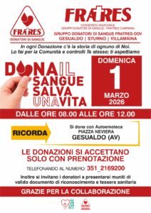 A Gesualdo torna la grande macchina della solidarietà: il prossimo 1° marzo, dalle 08:00 alle 12:00, il paese accoglierà in Piazza Neviera una nuova giornata dedicata alla donazione del sangue, promossa dal gruppo di donatori di sangue “FRATRES” operante nel territorio compreso tra Gesualdo, Villamaina e Sturno, un appuntamento che negli anni è diventato un vero simbolo di partecipazione civica e attenzione verso il territorio.