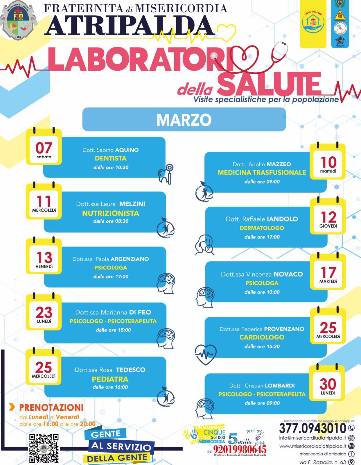 Una programmazione che abbraccia molte delle esigenze più diffuse: dalla salute orale alla nutrizione, dalla dermatologia alla psicologia, fino alla cardiologia e alla pediatria. Ogni incontro è affidato a specialisti qualificati, disponibili presso la sede della Misericordia in via F. Rapolla n. 63.