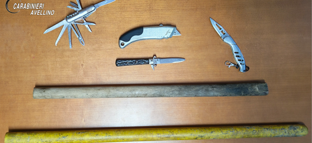 L’immediato intervento dei Carabinieri, già presenti in zona nell’ambito dei quotidiani servizi di controllo del territorio, ha consentito di rintracciare il soggetto segnalato che, a seguito di perquisizione personale e veicolare, è stato trovato in possesso di tre coltelli, due bastoni e un taglierino di grosse dimensioni.