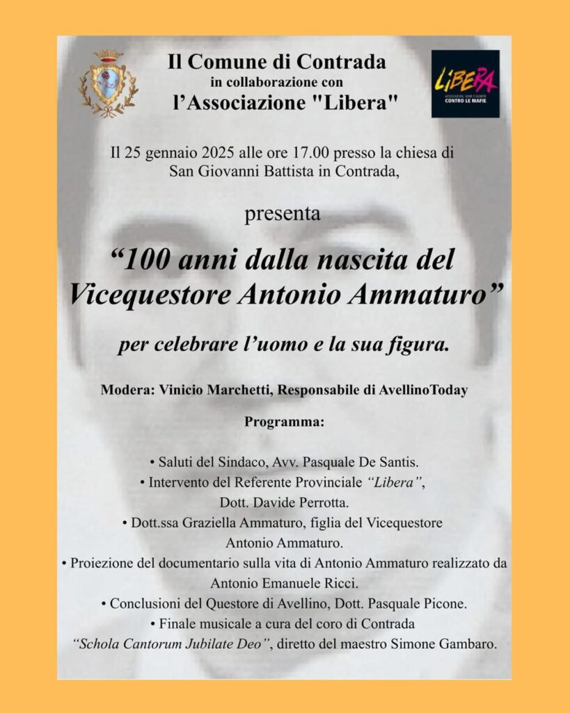 Il Comune di Contrada, in collaborazione con l’Associazione Libera, ha organizzato un evento speciale per commemorare il centenario della nascita del Vicequestore Antonio Ammaturo, figura emblematica della lotta contro la criminalità e simbolo di impegno per la giustizia. L’evento, che si terrà il 25 gennaio 2025 alle ore 17:00 presso la Chiesa di San Giovanni Battista a Contrada, rappresenta un’occasione unica per riflettere sulla figura di un uomo che ha dedicato la sua vita alla difesa della legalità, pagando con il sacrificio della sua stessa vita.