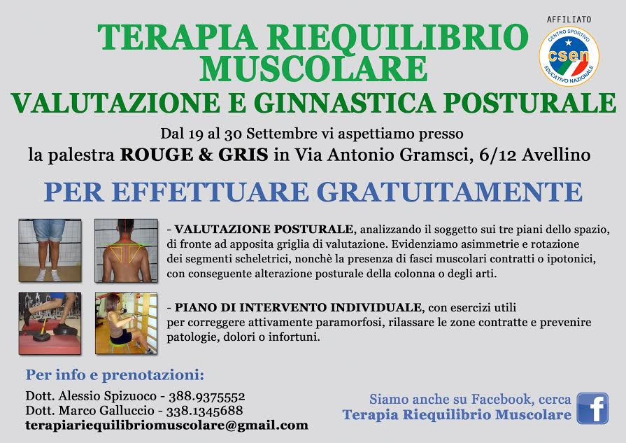 Nel Polo avellinese della terapia a partire dal 19 settembre fino alla fine del mese si effettueranno valutazioni posturali gratuite. Questa iniziativa nasce con l’intento di sensibilizzare la popolazione verso la cultura della prevenzione e dell’attività motoria adoperandola come “farmaco” per la cura del proprio corpo.