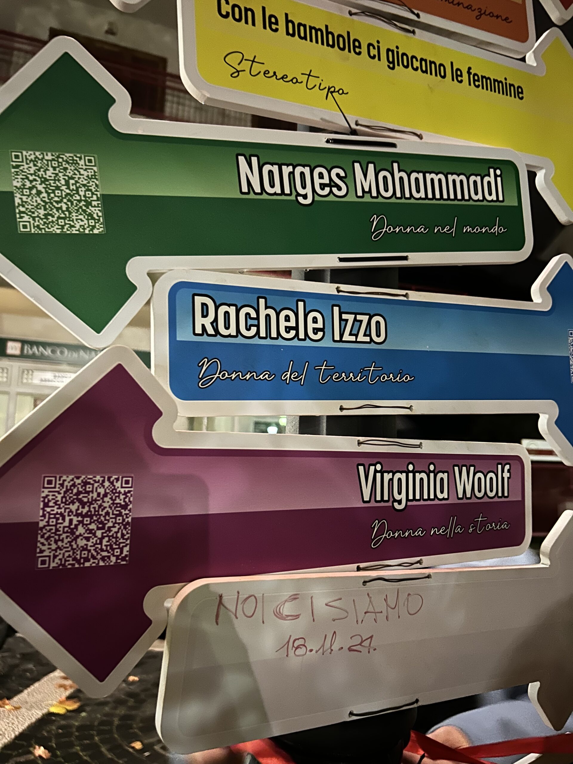 Non solo i volti e le storie di alcune vittime di femminicidio. Sulle frecce dai colori dell’arcobaleno anche gli stereotipi più comuni sulle donne e alcuni esempi di discriminazione femminile. Ma anche i nomi e le biografie di alcune figure che si sono contraddistinte nella storia, nel mondo e nelle realtà locali.