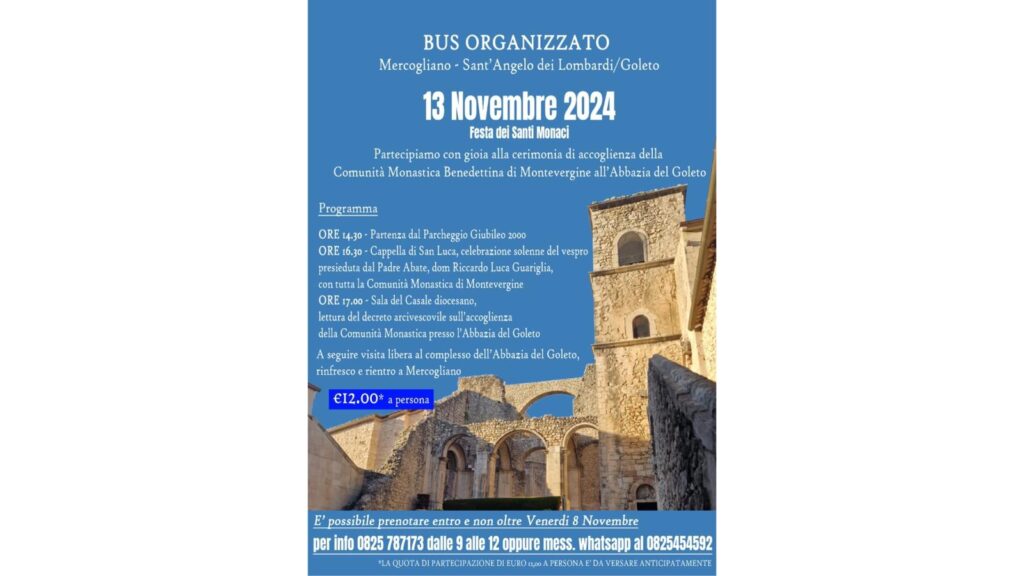 Se vuoi partecipare alla cerimonia di accoglienza dei Monaci di Montevergine, unisciti a noi! Partiremo in bus alle 14:30 dal parcheggio Giubileo2000, con arrivo previsto per i Vespri alle 16:30. Poi, lettura del decreto arcivescovile e interventi delle autorità. Dopo l’evento, avrai la possibilità di fare una visita libera all’Abbazia, gustare un piccolo rinfresco e rientrare a Mercogliano.