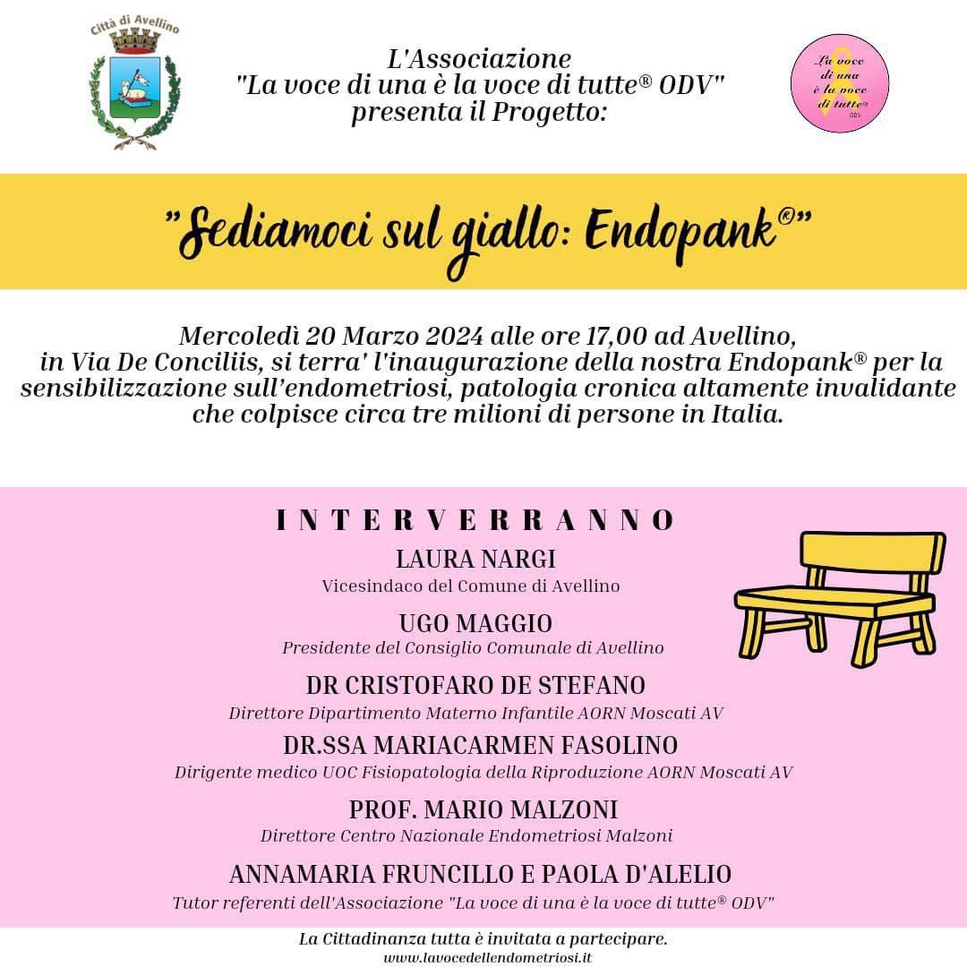 Una panchina gialla per accendere i riflettori sull’endometriosi. Il Comune di Avellino al fianco dell’associazione “La voce di una è la voce di tutte”, per sensibilizzare il territorio sulle problematiche di una patologia che colpisce tre milioni di persone in Italia. Eppure è ancora molto sottovalutata.