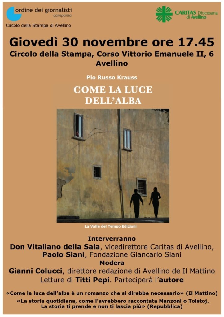 Giovedì 30 novembre, alle ore ore 17.45, al Circolo della Stampa di Avellino (Corso Vittorio Emanuele II, n. 6) si terrà un incontro sul romanzo Come la luce dell’alba (edizioni La Valle del Tempo).