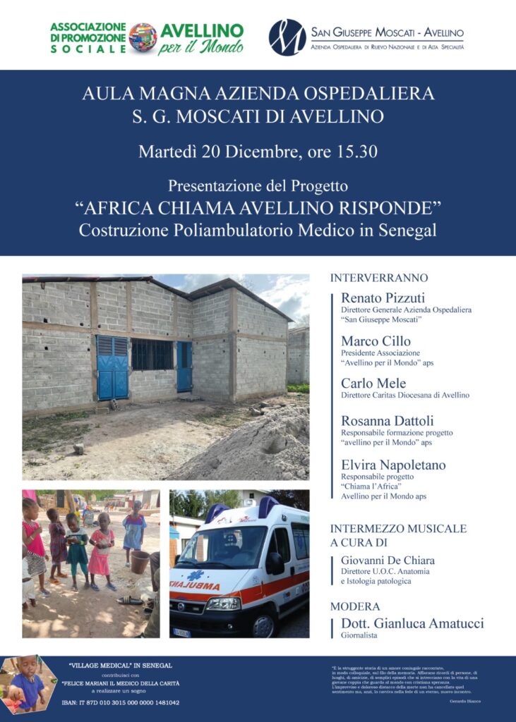 Un poliambulatorio in Senegal per offrire assistenza nelle discipline di Pediatria, Ginecologia e Medicina d’Urgenza: è il sogno dell’associazione “Avellino per il mondo”, che si è concretizzato in un progetto già in corso di realizzazione. Quanto è stato fatto e quanto resta da fare sarà l’argomento dell’incontro “Africa chiama, Avellino risponde”, che si terrà dopodomani, martedì 20 dicembre, alle ore 15,30, nell’aula magna dell’Azienda ospedaliera San Giuseppe Moscati.