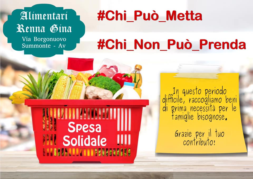 La lista delle iniziative di solidarietà si allunga grazie a Summonte, dove Alimentari “Renna Gina” di via Borgonuovo ha lanciato la spesa solidale, con lo slogan: “Chi può metta, chi non può prenda”. All’ingresso del negozio, c’è un carello, posizionato per partecipare alla “gara” che, a quanto pare, sta riscuotendo una buona partecipazione.