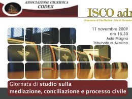 Avellino – Mercoledì 11 novembre, alle ore 15.30, presso l’Aula Magna del Tribunale di Avellino si svolgerà un convegno di studi sul tema “Conciliazione e Mediazione nel nuovo processo Civile”. L’iniziativa è promossa dall’Associazione Giuridica Codex in collaborazione con Isco Adr, organismo di conciliazione ed ente di formazione operante su tutto il territorio italiano. Il convegno si rivolge ad avvocati, praticanti avvocati, dottori commercialisti, e, più in generale, a tutti i laureati in scienze giuridiche ed economiche, ai quali saranno illustrate tutte le caratteristiche essenziali della conciliazione civile e della mediazione familiare. “Si tratta di due strumenti di risoluzione delle controversie; pur essendone diversi gli ambiti di operatività, entrambi sono accomunati dall’obbiettivo di aiutare le parti a comporre i loro conflitti, evitando il ricorso al processo”, specifica Cristiana Caruso, Presidente dell’Associazione Codex. A sottolineare l’importanza dell’iniziativa è la notizia di questi giorni relativa all’approvazione, da parte del Governo, dello schema di decreto legislativo sulle procedure di conciliazione e mediazione. “Dalle notizie pervenute, il provvedimento prevede che per le questioni riguardanti materie quali il condominio, la proprietà, le locazioni, etc… le parti potranno adire il giudice solo qualora non siano riuscite a comporre la questione attraverso la procedura di conciliazione. Ciò rende ancora più necessario per gli operatori del diritto, e per i cittadini, approfondire i principali aspetti di una procedura con la quale saranno chiamati sempre più spesso a confrontarsi”, continua l’avv. Caruso.