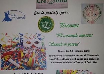 Si partirà domenica 26 febbraio: ritrovo alle 15.00 nella Piazza San Felice di Tavernola San Felice (fraz. Aiello del Sabato) dove partirà una sfilata per le strade della comunità con arrivo presso il Centro Sociale “Madre Teresa di Calcutta” dove inizierà la festa in maschera con balli ed animazione.