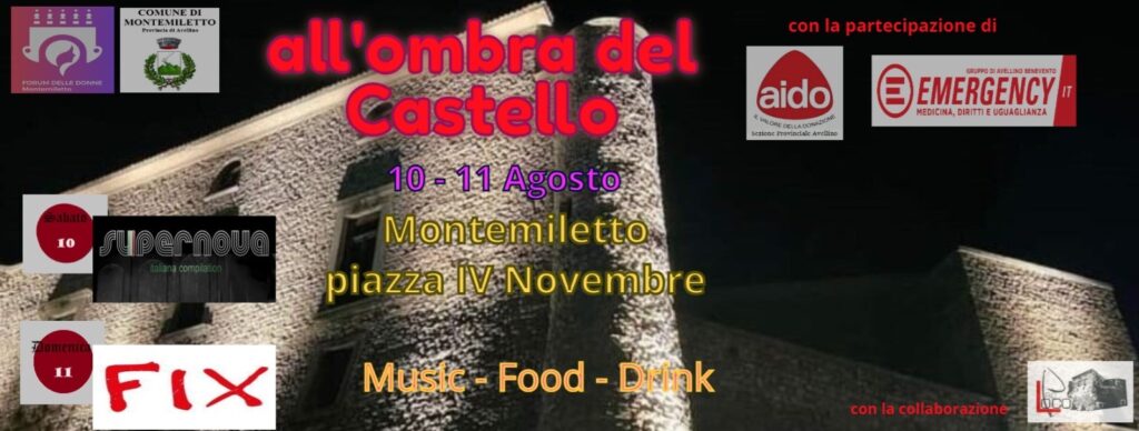 All’ombra del castello è il secondo evento targato Forum delle donne di Montemiletto. Si cambia location e format ma non mancheranno le sorprese. Il 10 e 11 agosto in piazza IV novembre, il forum vi aspetta per due serata all’insegna della musica, del divertimento e della solidarietà. “Dopo la riuscita dell’evento mont APE rto, non potevamo non replicarci nella piazza centrale del nostro paese, All’ombra del Castello, sarà il nostro evento centrale per questa estate. Due sere con cucina tipica, musica e solidarietà”, commenta cosi Il Presidente Sarro. “All’ombra del Castello, nasce proprio per mettere in risalto la parte storica del nostro paese e porre attenzione sull’attrazione più bella che abbiamo, che in questi giorni è stata arricchita ancora di più grazie all’Amministrazione che con caparbietà ha lavorato tantissimo e inaugurato il nuovo museo, il castello della Leonessa ha ripreso in mano la propria dignità e noi come forum potevamo solo metterlo al centro del nostro evento”. Il sabato sera saliranno sul palco i Supernova, band avellinese che ci delizierà con musica italiana rivisitata a modo loro in uno stile tutto particolare, mentre l’11 sarà la volta dei Fix che che ripercorreranno gli anni 90 attraverso le canzoni degli U2, Depeche Mode, Bob Marley. Tutto accompagnato con piatti tipici e fiumi di birra. La domenica mattina in piazza i bambini potranno divertirsi con i gonfiali e ci sarà un po di mont APE rto in Montemiletto, perchè dalle 11 alle 13 sarà possibile fare aperitivo all’ombra del Castello. Sia il sabato che la domenica sera saranno presenti con una loro postazione AIDO ed EMERGENCY per sensibilizzare le persone a temi che oggi risultano ancora sconosciuti a molti. “Ho voluto la collaborazione delle due associazioni perchè in questo periodo molto delicato che stiamo vivendo mi è sembrato giusto che loro ci fossero, per sensibilizzare le persone e far capire che fare del bene è una scelta e che solo facendo del bene avremo indietro il bene! Siamo un’associazione che non perde mai di vista il sociale e vogliamo dare un aiuto concreto a chi ne ha bisogno”. Conclude Sarro. il 10 e 11 agosto il forum vi aspetta in piazza IV novembre a Montemiletto.