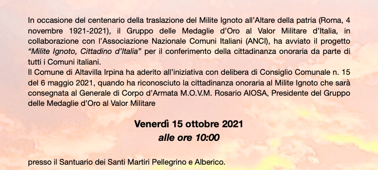 In occasione del centenario della traslazione del feretro all’Altare della Patria, il Comune di Altavilla Irpina ha conferito la Cittadinanza Onoraria al Milite Ignoto, simbolo delle vittime di tutti i conflitti armati, aderendo così al progetto sostenuto dall’A.N.C.I., dal Gruppo Medaglie d’Oro al Valore Militare d’Italia e dall’Arma dei Carabinieri.