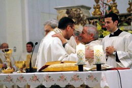 Ieri 25 novembre 2012 nel giorno in cui la Chiesa festeggia Cristo Re, al santuario dei santi Martini Pellegrino ed Alberico Crescitelli di Altavilla Irpina, tutta la comunità ha dato saluto all’amato don Giuseppe Martino, che ha svolto presso la parrocchia di Altavilla il suo apostolato per 26 anni e che, da oggi, presterà servizio presso la curia di Benevento, succedendogli nel Mistero Pastorale, don Livio Iannaccone, nativo di Altavilla. Nel santuario circa 1000 le persone intervenute alla cerimonia religiosa; 300 i fedeli venuti con 4 pullman e mezzi propri dai comuni di Calvi e da San Giorgio del Sannio dove Don Livio Iannaccone ha svolto in questi anni la missione pastorale. Tra i fedeli nei banchi l’amministrazione del Comune di Altavilla, oltre al Sindaco di Calvi Armando Rocco e al Comandante della stazione dei Carabinieri di San Giorgio, luogotenente Pietro Dalì. Presente anche il Preside Commendatore Avvocato dell’Ordine equestre del Santo Sepolcro di Gerusalemme Antonio Emilio Gambacorta, ordine di cui fa parte lo stesso don Livio Iannaccone. A celebrare la Santa Messa il Vescovo di Benevento Monsignore Andrea Muggione. E’ intervenuto, a fine celebrazione, il sindaco di Altavilla Carmine Coviello, salutando con affetto don Giuseppe Martino, conosciuto da tutti ad Altavilla come don Peppino, ringrazioandolo per la sua “generosità, semplicità, disponibilità, la consapevolezza di agire sempre nel nome di Dio, verso gli ammalati, le persone anziane ed i deboli, con una predilezione particolare verso i ragazzi che ha preparato ai sacramenti della vita cristiana, accompagnandoli nelle loro scelte, aiutandoli negli studi e perfino giocando con loro, utilizzando in definitiva, a tutto campo il suo ascendente per le loro diverse esigenze ed attitudini…”. Il sindaco Coviello ha continuato ringraziando ancora don Giuseppe Martino per aver lavorato fianco a fianco in un progetto di solidarietà, in un territorio difficile come Altavilla, “lembo d’Irpinia, zona interna e disagiata del Mezzoggiorno d’Italia” in momenti difficili per l’economia e lo spirito, che ha visto tanta emigrazione verso terre lontane come l’Australia, dove tra l’altro don Giuseppe è stato accolto con benevolenza ed entusiasmo dalla comunità degli altavillesi di Adelaide cui andò anni a dietro a far visita. Don Livio a chiusura della celebrazione, prende parola e sistema il microfono ben saldo davanti a sè, quasi a rimarcare la fermezza con cui ha intenzione di essere pastore ad Altavilla, ringrazia Don Peppino ricordando quando è diventato parroco di Altavilla, e il paese non aveva nemmeno una chiesa vera,in quanto la chiesa madre, dedicata alla santissima Madonna Assunta, oggi santuario, era stata resa inagibile dal terremoto dell’80. Don Livio ha ringraziato con affetto don Peppino per averlo ha accompagnato lungo il suo seminario e ricorda la sua celebrazione della cerimonia religiosa della vestizione nel ’93. Ieri don Livio raccoglie l’eredità di tutti i suoi precedessori, tra cui anche don Pacino de Palma e spera di poter essere vicino a tutti i suoi fedeli, ricordando anche lui, come il sindaco Coviello, l’emigrazione in tutto il mondo degli abitanti di Altavilla e riconoscendo nelle parole del Vescovo Muggione “la paternità” del sacerdote verso i fedeli della propria comunità, conclude dicendo, citando Papa Giovanni XXIII, che chiunque sia stato presente alla messa andando a casa porti la carezza di don Livio ad ammalati e bambini. Salutando uno per uno i fedeli dà a ciascuno un immagine di Cristo Pastore e Sant’Alberico Crescitelli, martire in Cina, nativo di Altavilla, in cui si legge: “Dio mi ha voluto qui. Bisognerebbe che neppure un giorno delle nostra dimora qui andasse perduto per quanto riguarda l’evengelizzazione”. frase tratta dall’Epistolario di Sant’ Alberico Crescitelli alla madre. Questa frase risuona molto simile a quella con cui don Livio, Arciprete e parroco, ha ringraziato il vescovo di Benevento Monsignore Andrea Muggione, per aver saputo conciliare, con il trasferimento ad Altavilla, un obbligo e un desiderio.