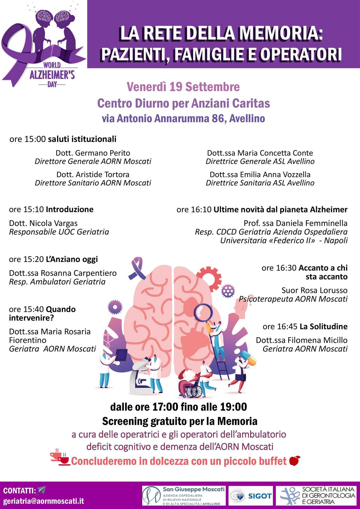 Gli anziani che frequentano il centro saranno accolti dai geriatri dell’Azienda Moscati – tra cui Rosanna Carpentiero, Maria Rosaria Fiorentino e Filomena Micillo – che effettueranno gratuitamente il test della memoria, uno strumento semplice ma fondamentale per la diagnosi precoce delle demenze. Non solo visite: mentre i medici si prenderanno cura degli ospiti, i familiari e i caregiver potranno partecipare a un momento di incontro e di dialogo, per ricevere consigli e informazioni utili sulla gestione quotidiana delle persone fragili. Il momento informativo, introdotto dal presidente del Centro diurno per Anziani, Alfonsina Nazzaro, vedrà gli interventi dei Direttori generali dell’Azienda Moscati e dell’Asl Avellino, rispettivamente Germano Perito e Maria Concetta Conte, e dei Direttori sanitari delle due Aziende, Aristide Tortora ed Emilia Anna Vozzella: un confronto tra i protagonisti della sanità irpina, segno del rinnovato impegno nel costruire una rete di prossimità e di continuità ospedale-territorio, che metta insieme pazienti, famiglie e operatori, offrendo vicinanza, ascolto e qualità delle cure. Al dibattito porteranno la loro esperienza anche Daniela Femminella, responsabile del Centro Disturbi Cognitivi e Demenze dell’Università degli Studi Federico II di Napoli, l’organizzatore dell’evento, Nicola Vargas, e suor Rosa Lorusso, psicoterapeuta dell’Azienda Moscati, che aggiungeranno un contributo scientifico e umano al tempo stesso. Il pomeriggio al Centro diurno per Anziani sarà così un’occasione da un lato per dimostrare che la sanità non si limita a curare, ma va incontro ai bisogni delle persone, portando prevenzione e vicinanza direttamente sul territorio, dall’altro, per conoscere le persone fragili là dove trascorrono parte del loro tempo, circondate da volontari che animano i pomeriggi coinvolgendo gli ospiti in attività sociali, ricreative, in laboratori: momenti relazionali che aiutano a combattere la solitudine e l’isolamento.
