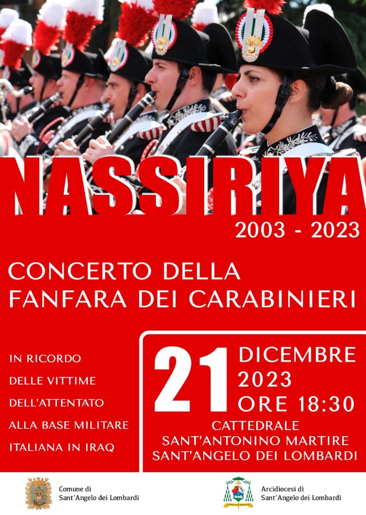 Giovedì 21 dicembre, alle ore 18:30, presso la Cattedrale Sant’Antonino Martire di Sant’Angelo dei Lombardi, la Fanfara del 10° Reggimento Carabinieri Campania, terrà un concerto in ricordo del ventesimo anniversario della strage di Nassiriya, al quale sono invitati ed interverranno le Autorità militari e civili, locali e provinciali.