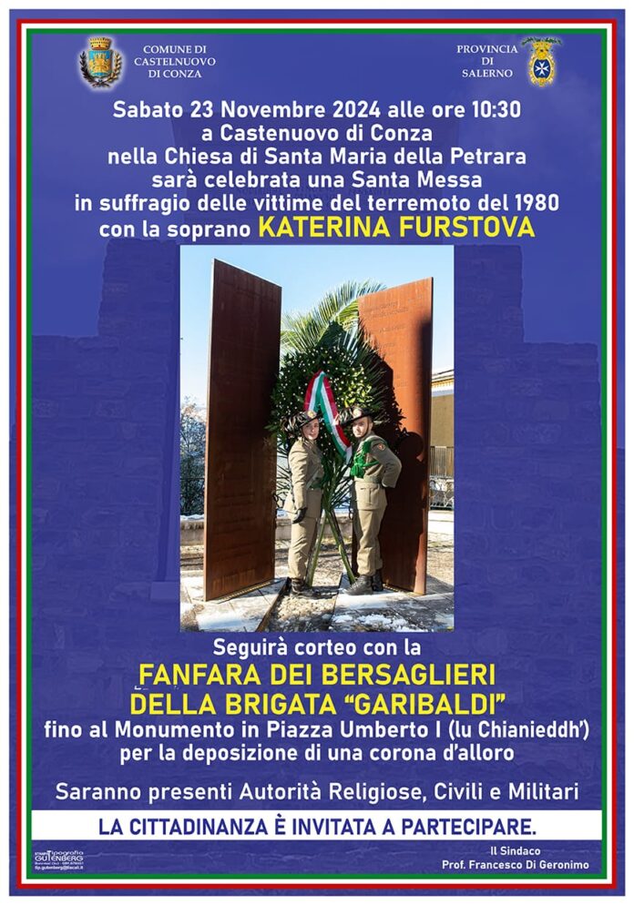 L’esibizione musicale della Fanfara della Brigata Garibaldi di Caserta accompagnerà gli interventi dei rappresentanti Istituzionali di Comune, Provincia, Regione, Esercito Italiano e Parlamento, e la voce del la soprano Katerina Furstova a caratterizzare i momenti di preghiera, in ricordo delle vittime del terremoto che il 23 novembre 1980 devastò i comuni del cratere salernitano e dell’Irpinia, provocando migliaia di morti, feriti e sfollati.