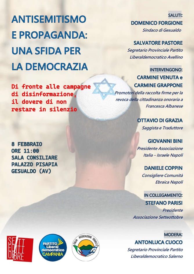 Il convegno “Antisemitismo e propaganda: una sfida per la democrazia” è in programma per sabato 8 febbraio alle ore 11.00 presso la Sala Consiliare di Palazzo Pisapia a Gesualdo (AV), uno dei primi Comuni in Italia ad aver conferito la cittadinanza onoraria a Francesca Albanese.