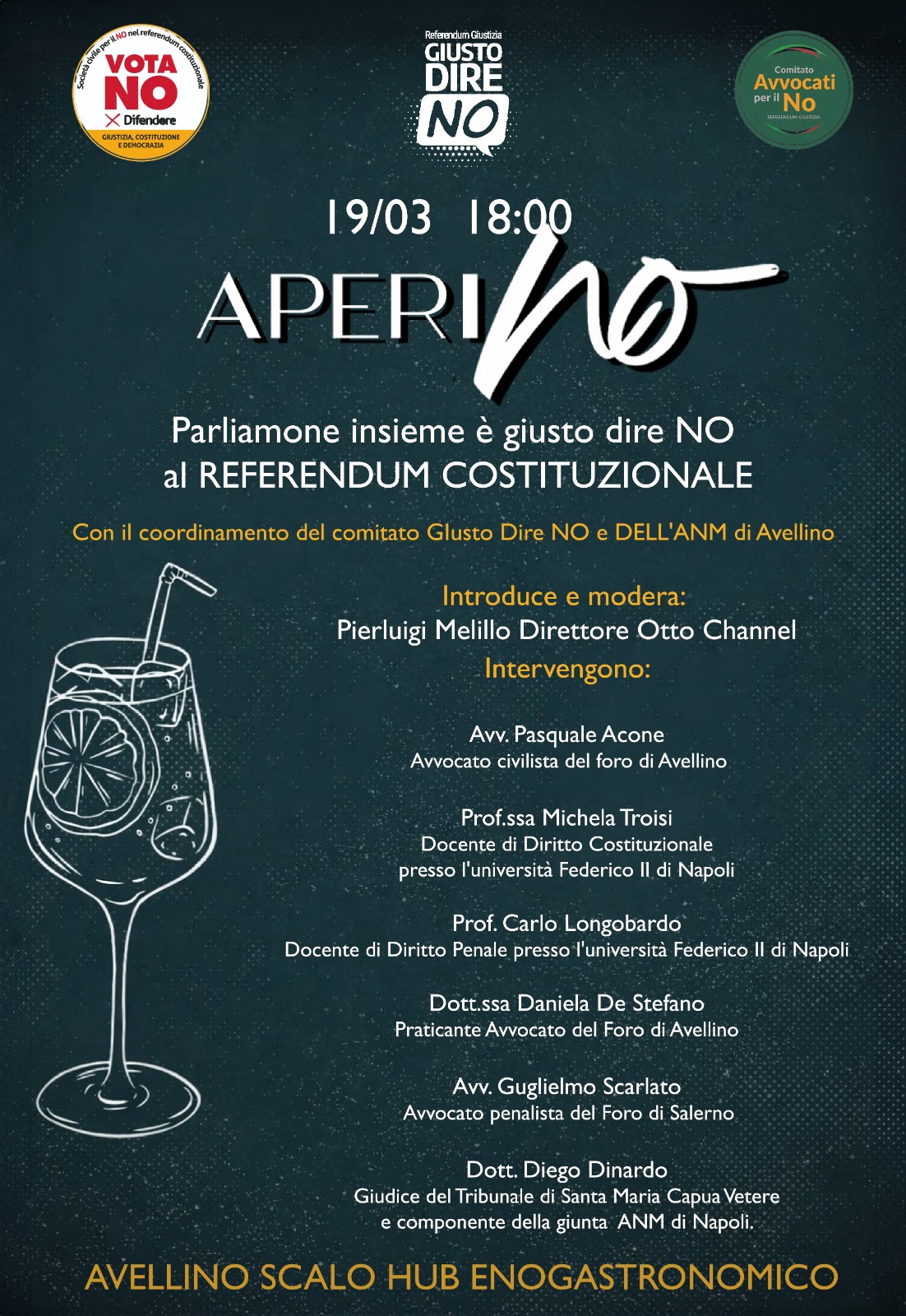 AVELLINO- “AperiNo” , l’ evento organizzato dai Comitati per il No alla Riforma Nordio (Società Civile, Giusto Dire no e Avvocati per il No) questo pomeriggio alle 18 presso l’hub Avellino Scalo. “Parliamone insieme è giusto dire NO al Referendum costituzionale. Introduce e modera:Pierluigi Melillo Direttore Otto Channel. Intervengono: Pasquale Acone, Avvocato civilista del foro di Avellino; Michela Troisi Docente di Diritto Costituzionale presso l’università Federico ll di Napoli; Carlo Longobardo Docente di Diritto Penale presso l’università Federico lIl di Napoli; Daniela De Stefano, Praticante Avvocato del Foro di Avellino; Guglielmo Scarlato, avvocato penalista del Foro di Salerno; Diego Dinardo, giudice del Tribunale di Santa Maria Capua Vetere e componente della giunta ANM di Napoli.
