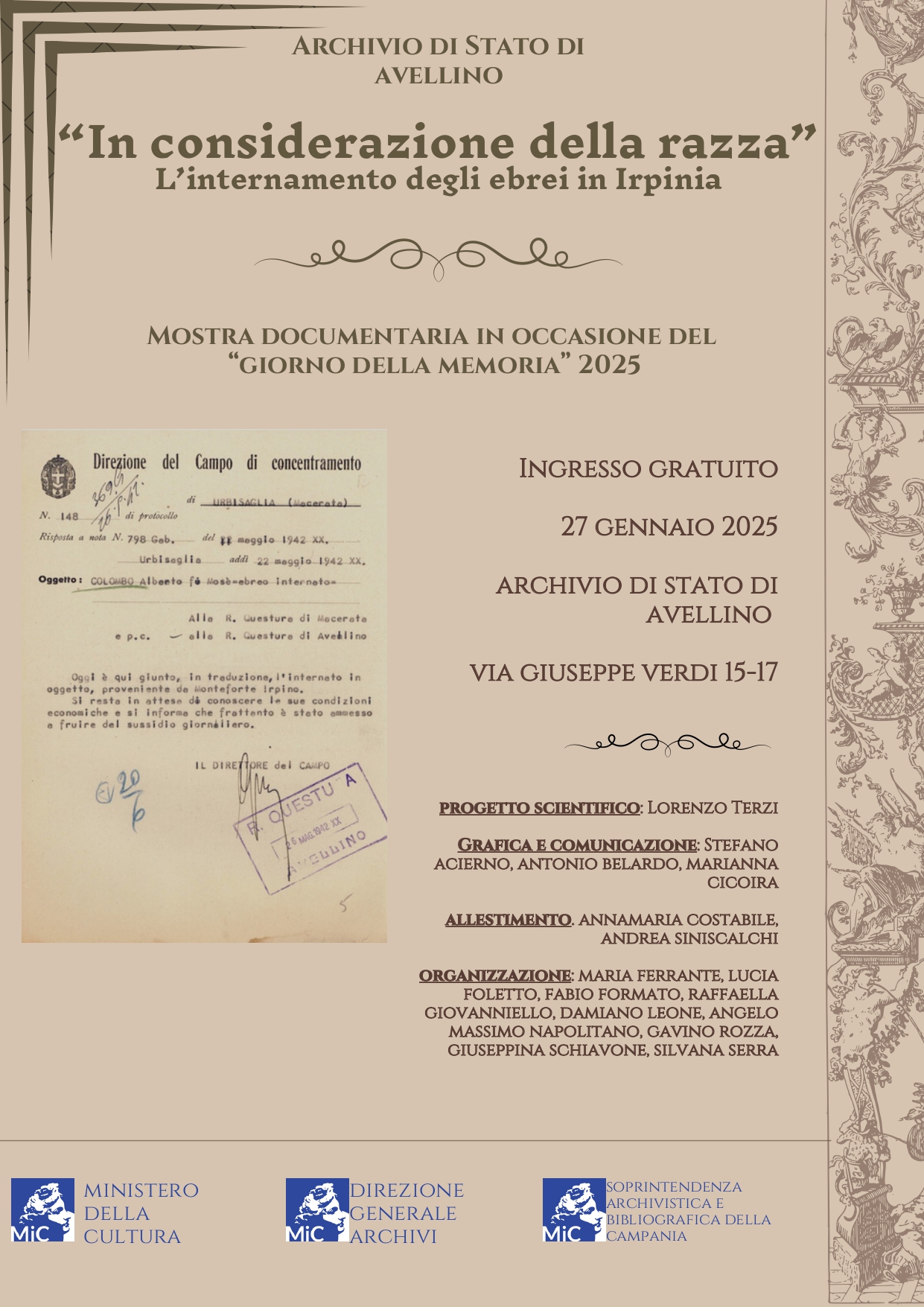 In occasione del Giorno della Memoria, l’Archivio di Stato di Avellino ha allestito una significativa mostra documentaria dal titolo “In considerazione della razza”, che si concentrerà sull’internamento degli ebrei in Irpinia.