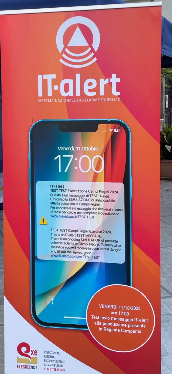Venerdì 11 Ottobre 2024 alle ore 17.00 su tutti i cellulari presenti in Regione Campania arriverà messaggio ALERT relativo al passaggio simulato allerta Rossa di imminente attività vulcanica zona Campi Flegrei.