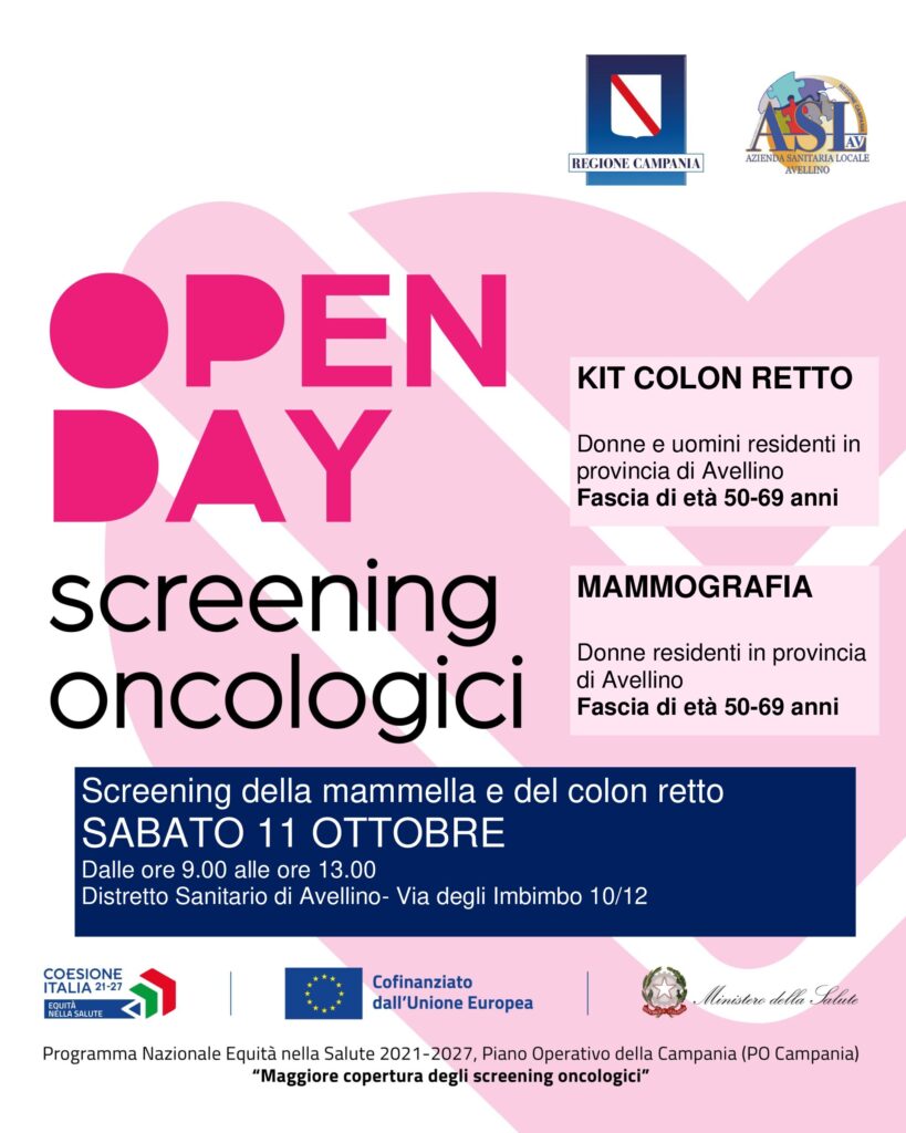 Sabato 11 ottobre presso il Distretto di Avellino in via degli Imbimbo 10/12 dalle ore 9.00 alle ore 13.00, sarà possibile sottoporsi allo Screening della Mammella e del Colon retto. Le donne nella fascia di età 50-69 anni residenti in provincia di Avellino, tramite prenotazione alla Centrale Screening oncologici (tel. 0825 292029 dalle ore 9.00 alle ore 14.00) oppure