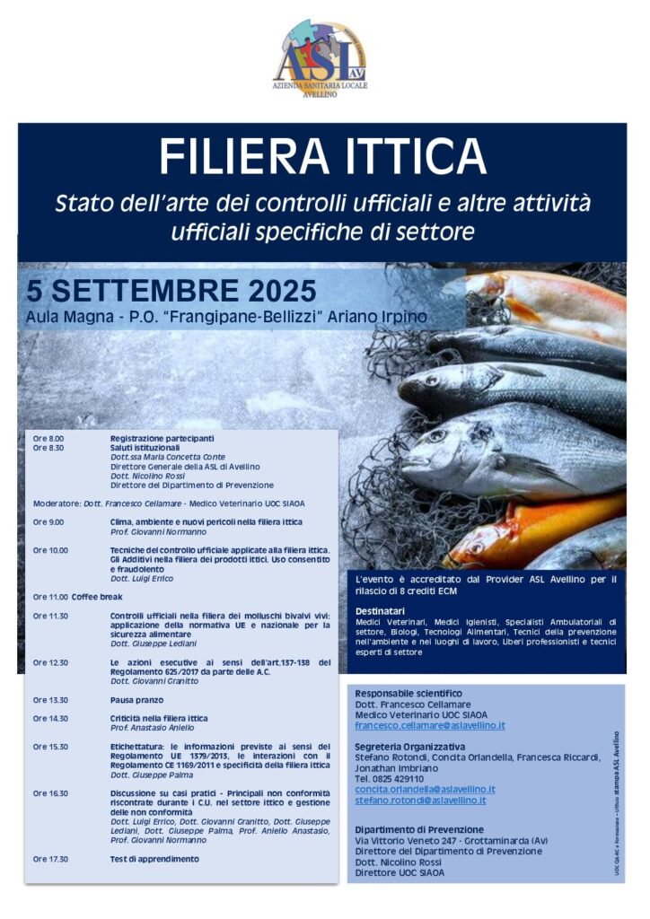 Il sistema dei controlli in materia di igiene e sicurezza alimenti nella filiera ittica è al centro dell’evento formativo promosso dal Dipartimento di prevenzione dell’Asl di Avellino. Il corso dal titolo “Filiera Ittica – Stato dell’arte dei controlli ufficiali e altre attività ufficiali specifiche di settore” si terrà venerdì 5 settembre nell’Aula Magna del P.O. “Frangipane-Bellizzi” di Ariano Irpino e vedrà la partecipazione di esperti del settore impegnati a vario titolo nella filiera dei prodotti ittici, dall’allevamento fino alla vendita e consumo, a garanzia della sicurezza alimentare.