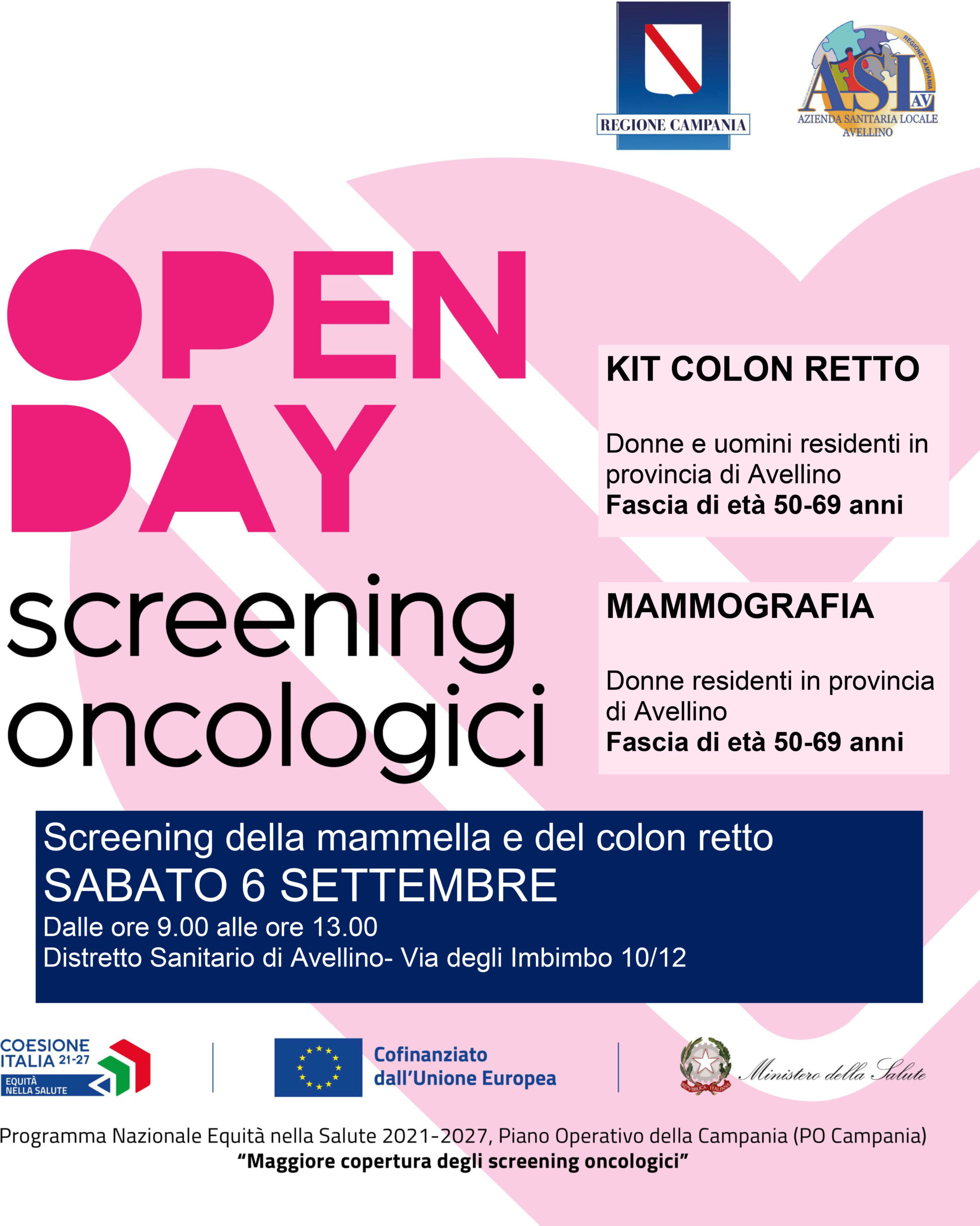 Le donne nella fascia di età 50-69 anni residenti in provincia di Avellino, tramite prenotazione alla Centrale Screening oncologici (tel. 0825 292029 dalle ore 9.00 alle ore 14.00) oppure presentandosi direttamente presso il Distretto Sanitario, potranno effettuare gratuitamente la mammografia senza necessità di impegnativa del medico. Inoltre, le donne e gli uomini nella fascia di età 50-69 anni residenti in provincia di Avellino potranno sottoporsi a screening del colon retto.