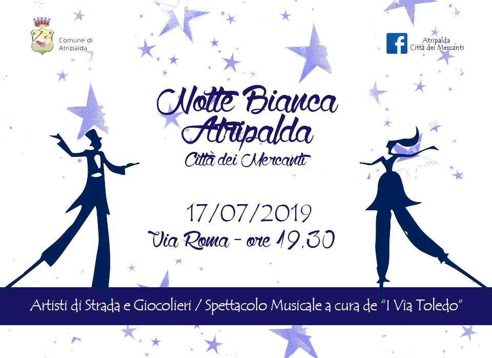 Mercoledì 17 luglio invece, dalle 19.30 ci sarà la Notte Bianca con gli spettacoli degli artisti di strada, trampolieri e giocolieri che lungo Via Roma animeranno lo shopping serale organizzato in collaborazione con i commercianti e l’assessorato al commercio. Alle 22 vivacissimo spettacolo musicale con il sound mediterraneo de I Via Toledo.