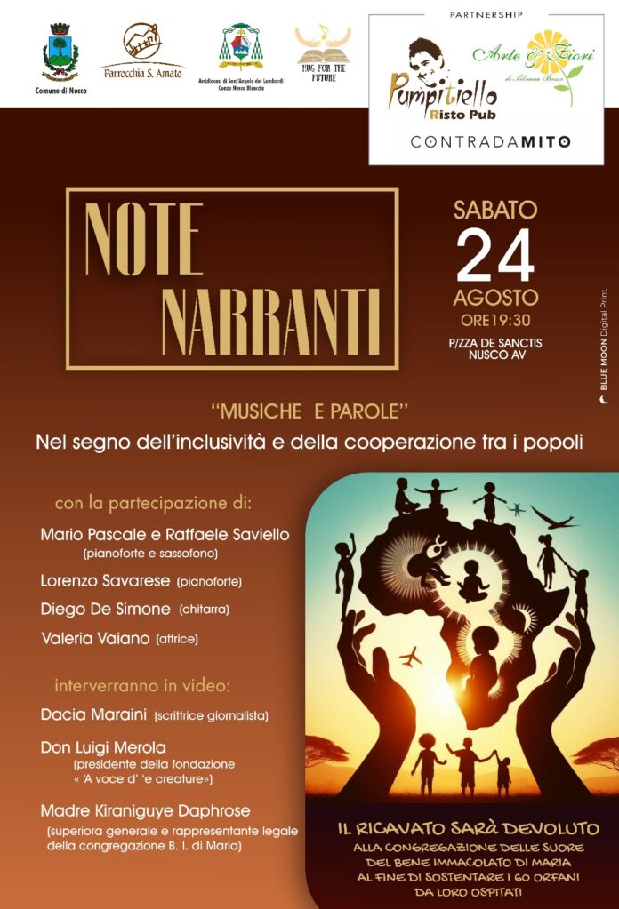 Il 24 agosto 2024, alle ore 19.30, in piazza De Sanctis a Nusco ( AV), con il patrocinio dell’Arcidiocesi di Sant’Angelo dei Lombardi e del Comune di Nusco, si svolgerà l’evento dal titolo “Note Narranti – nel segno dell’inclusività e della cooperazione tra popoli”.