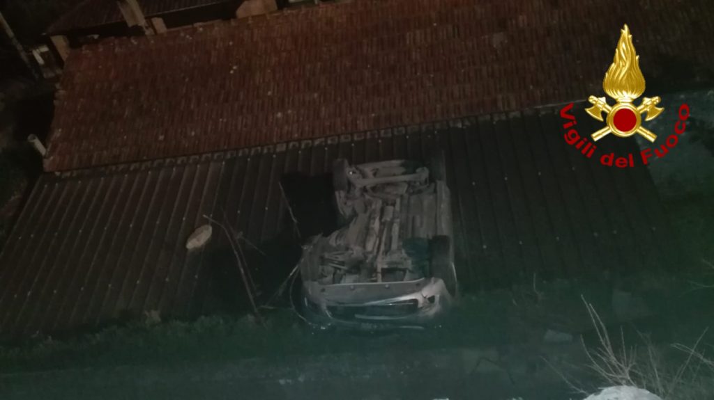 La vettura sbandando è finita fuori strada cadendo sul tetto di un’abitazione sottostante.