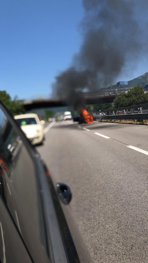 Traffico bloccato per diversi minuti sul raccordo Avellino-Salerno, in direzione del capoluogo salernitano, a causa di un autoveicolo che è andato a fuoco.