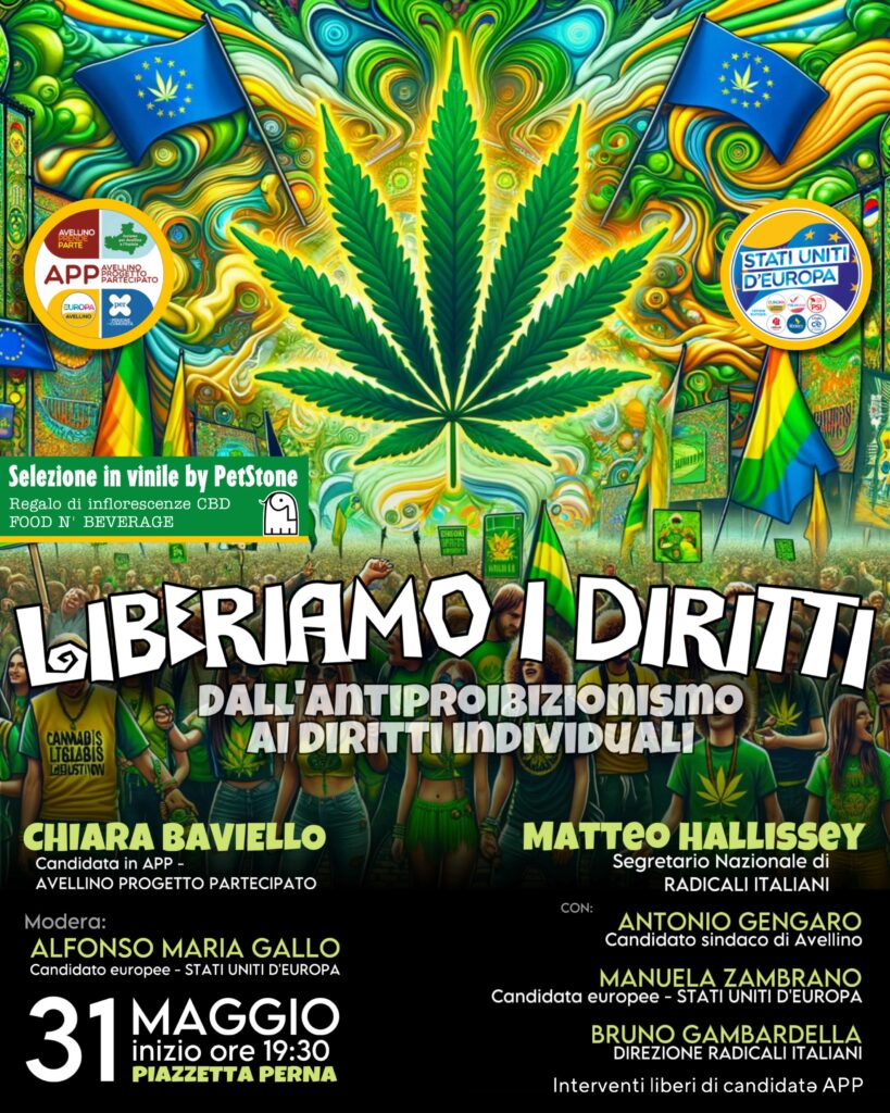 Oggi, venerdì 31 maggio, alle ore 19:30, in Piazzetta Perna ad Avellino una serata dedicata alla discussione sulla liberalizzazione della canapa, con focus sui diritti e le libertà individuali. Con Chiara Baviello, giovane imprenditrice del primo Canapa Grow Shop di Avellino oggi candidata nella lista APP: AVELLINO PROGETTO PARTECIPATO, che condividerà la sua esperienza in un settore non ancora ben compreso. Matteo Hallisey, segretario nazionale dei Radicali Italiani, noti per le battaglie per la liberalizzazione, parteciperà evidenziando l’importanza di queste tematiche.