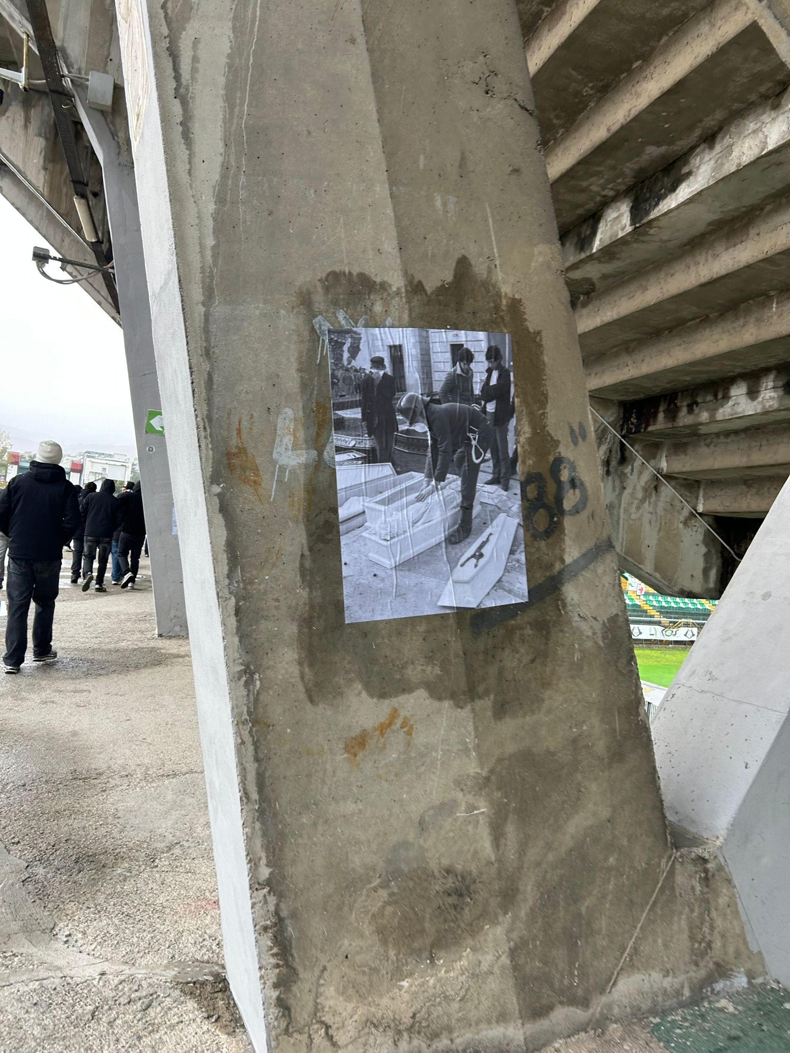 Le immagini hanno trasformato l’ingresso in Curva in un piccolo spazio di memoria e rispetto.
