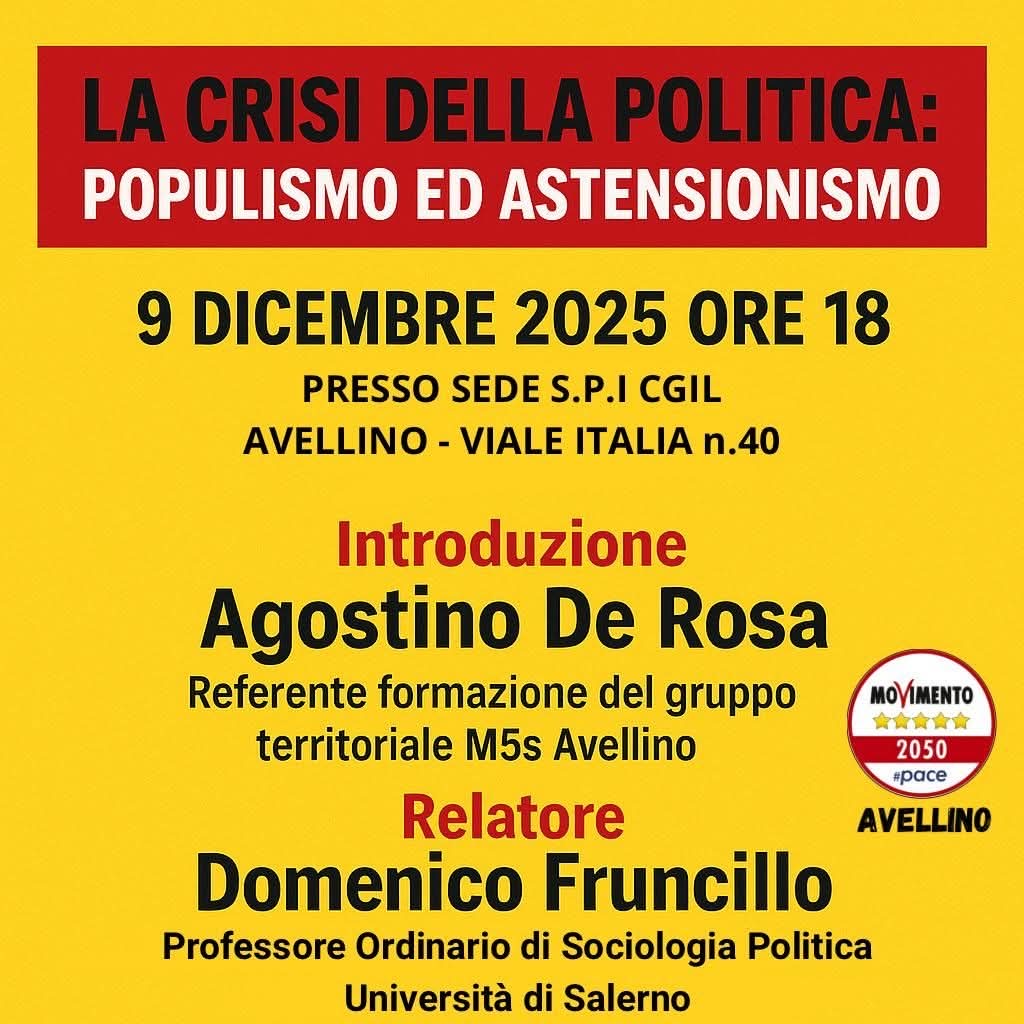 Il 09 dicembre 2025 alle ore 18,00, ad Avellino, presso la sede dello SPI CGIL in viale Italia 40, il Gruppo territoriale di Avellino del Movimento 5 Stelle ha organizzato un incontro pubblico sul tema “CRISI DELLA POLITICA: POPULISMO ED ASTENSIONISMO”, con introduzione di Agostino De Rosa, responsabile della Formazione del G.T. del M5S, e relazione di Domenico Fruncillo professore ordinario di Sociologia Politica dell’Università di Salerno.