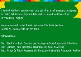Avellino – I Verdi di Avellino a confronto sul ciclo dei rifiuti e sull’emergenza campana. Al centro dell’incontro l’ipotesi della realizzazione di un inceneritore in provincia di Avellino. L’appuntamento è stato fissato per sabato 20 gennaio alle ore 17.00 presso il centro sociale “Samantha della Porta”. Interverranno Gianfranco Turis (Consulta per la salvaguardia dell’ambiente di Avellino), Gianluca Festa (Presidente provinciale dei Verdi) e Walter De Pietro (Assessore alla Protezione Civile della Provincia di Avellino).