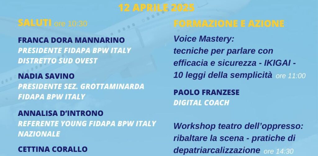 con i saluti Franca Dora Mannarino, Presidente Fidapa Bpw Italy Distretto Sud Ovest, a seguire Rosa Ciampa, Vicepresidente Sez. Grottaminarda Fidapa Bpw Italy, Giancarlo Ruggiero, Sindaco di Mirabella Eclano, Giusy Di Flumeri, Referente Young Fidapa Bpw Italy Distretto Sud Ovest, Ilaria Minichiello, Referente Young Sez. Grottaminarda Fidapa Bpw Italy, Rosaria Bruno, Vice Presidente Commissione Pari Opportunità del Consiglio Regionale della Regione Campania; modera Nadia Savino, Presidente Sez. Grottaminarda Fidapa Bpw Italy.