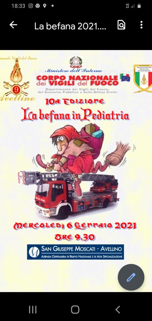 La vicinanza con il mondo dei bambini ha da sempre contraddistinto il Corpo Nazionale dei Vigili del Fuoco, infatti anche quest’anno, per la decima edizione consecutiva, i Vigili del Fuoco di Avellino insieme all’Associazione Nazionale Vigili del Fuoco e all’UNICEF, in occasione della festività dell’Epifania, porteranno regali e dolciumi al reparto di Pediatria dell’Ospedale “Moscati” di Avellino.
