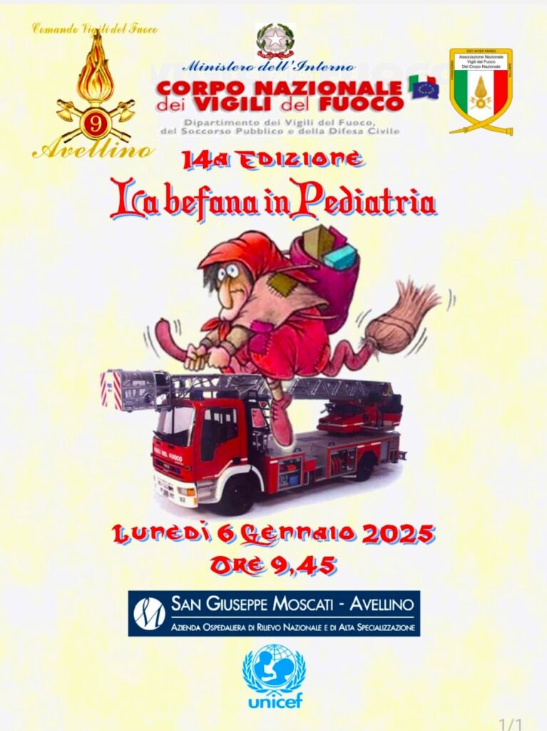 I “Vigili del Fuoco di Avellino” unitamente al personale dell’ “Associazione Nazionale del Corpo Sezione di Avellino” , Vi danno appuntamento per la quattordicesima edizione della “Befana in Pediatria”. L’appuntamento per lunedì sei gennaio alle ore 09’45 , tradizionale giorno dell’Epifania, nel piazzale dell’ospedale antistante il reparto di Pediatria, dove la Befana con l’autoscala dei Vigili del Fuoco salirà al secondo piano per portare calze e dolciumi ai piccoli degenti del reparto Pediatria dell’Ospedale Moscati di Avellino.