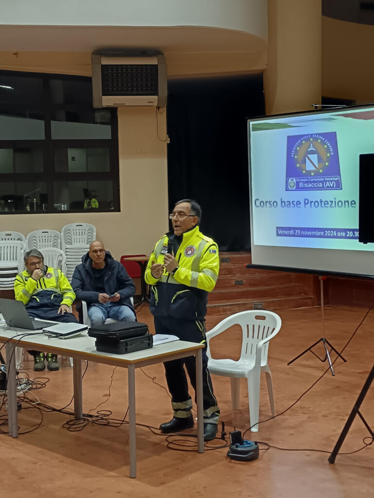 La serata è continuata con una lezione sui principi base del funzionamento della Protezione Civile a cura dell’architetto Giovanni Maggino, Coordinatore del Gruppo Comunale Volontari della Protezione Civile di Bisaccia. L’intervento si è focalizzato molto sull’illustrazione del sistema di Protezione Civile, con un focus particolare sul ruolo che ha il Comune e i suoi cittadini in caso di emergenza.