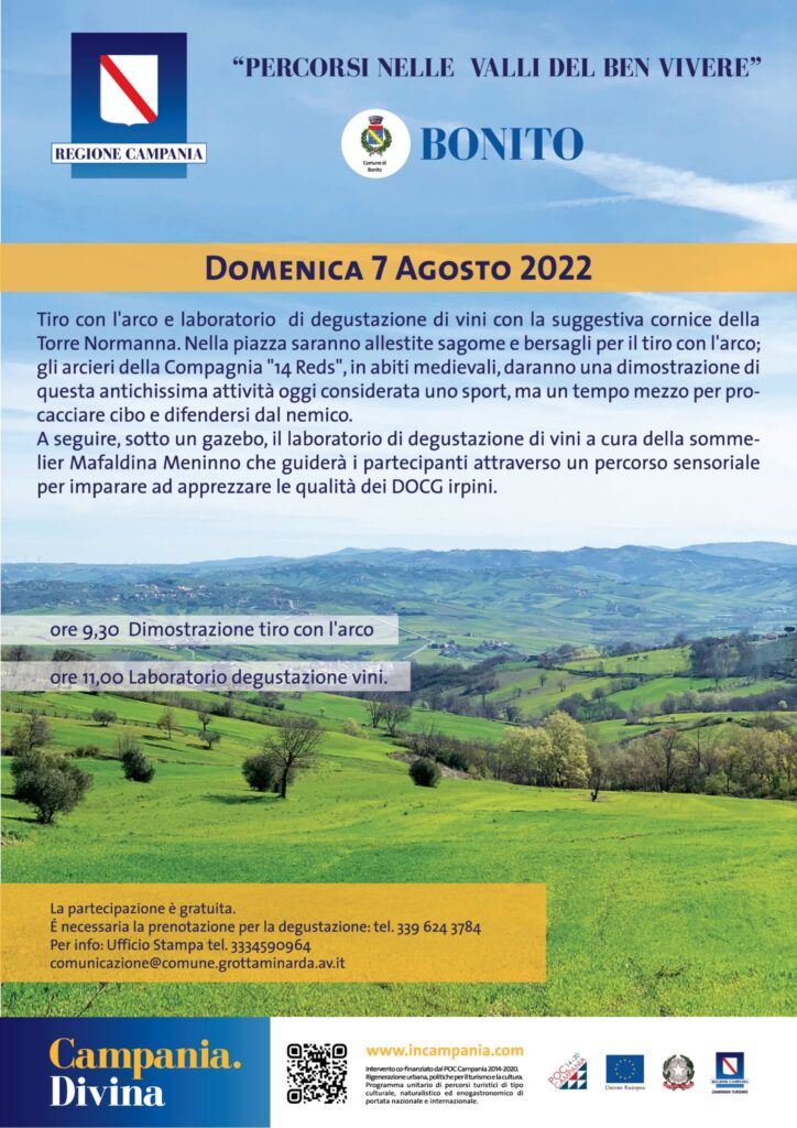 “Percorsi nelle Valli del Ben Vivere” torna domenica 7 agosto a Bonito con il tiro con l’arco ed il laboratorio di degustazione vini irpini DOC e DOCG sotto la Torre Normanna.
