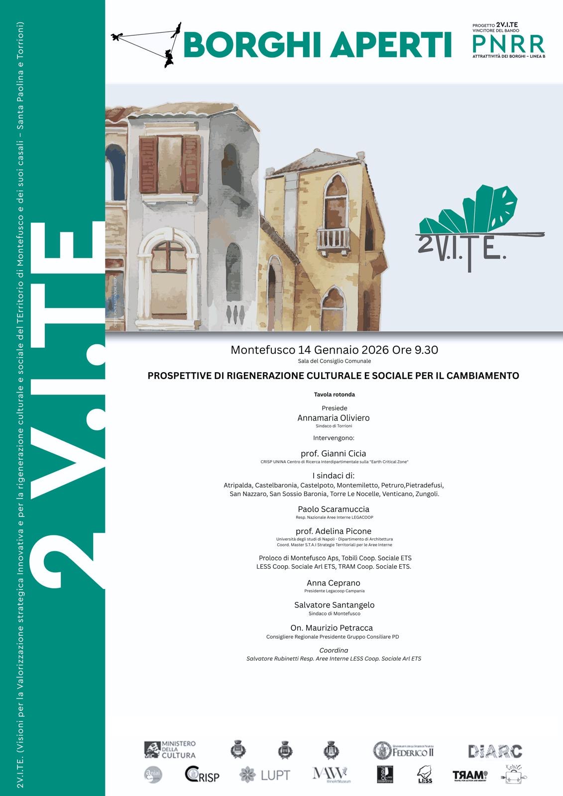 MONTEFUSCO – Si terrà mercoledì 14 gennaio 2026, alle ore 9:30, presso la Sala del Consiglio Comunale di Montefusco, la tavola rotonda “Borghi Aperti: Prospettive di rigenerazione culturale e sociale per il cambiamento”. L’incontro rappresenta un momento cruciale per il progetto 2 V.I.TE. (Visioni per la Valorizzazione strategica Innovativa e per la rigenerazione culturale e sociale del Territorio), iniziativa finanziata con 2,5 milioni di euro dal bando PNRR Attrattività dei Borghi – Linea B.
