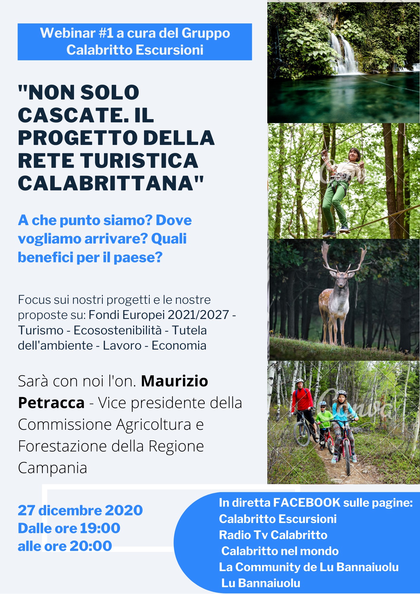 Per l’associazione, parteciperanno al webinar il presidente Saverio Perna, Francesco Ficetola, Alfredo Raimato, Luigi Mattia, Alessandro Giordano. Modera Gelsomino Del Guercio. Sarà trasmesso in diretta Facebook sulle pagine Calabritto Escursioni, Calabritto nel Mondo, Radio Tv Calabritto, La Community de Lu Bannaiuolu.