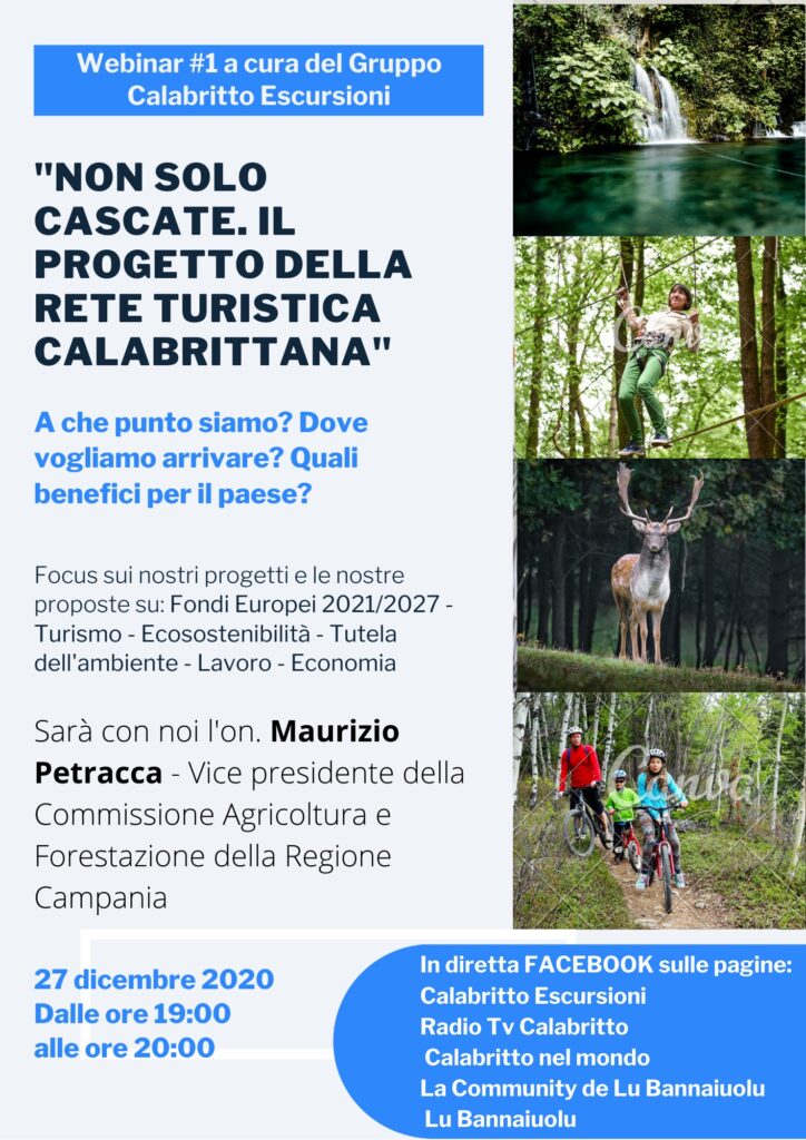 Per l’associazione, parteciperanno al webinar il presidente Saverio Perna, Francesco Ficetola, Alfredo Raimato, Luigi Mattia, Alessandro Giordano. Modera Gelsomino Del Guercio. Sarà trasmesso in diretta Facebook sulle pagine Calabritto Escursioni, Calabritto nel Mondo, Radio Tv Calabritto, La Community de Lu Bannaiuolu.