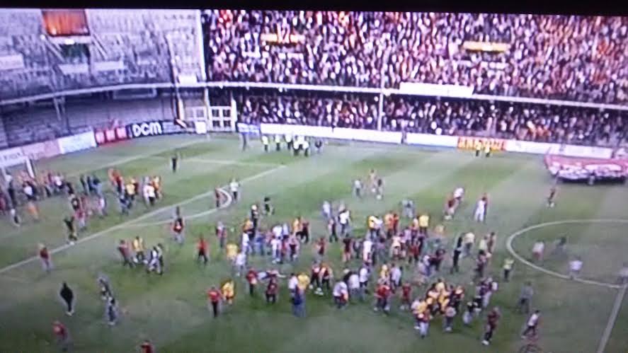 E’ finita la gara tra Benevento e Lecce, partita che determina l’approdo in Serie B dei giallorossi dopo 87 anni di storia. Invasione di campo liberatoria per i supporters sanniti che esultano grazie ad un 3-0 che suggella una grande stagione dopo anni di delusioni e di sconfitte all’ultimo sussulto.