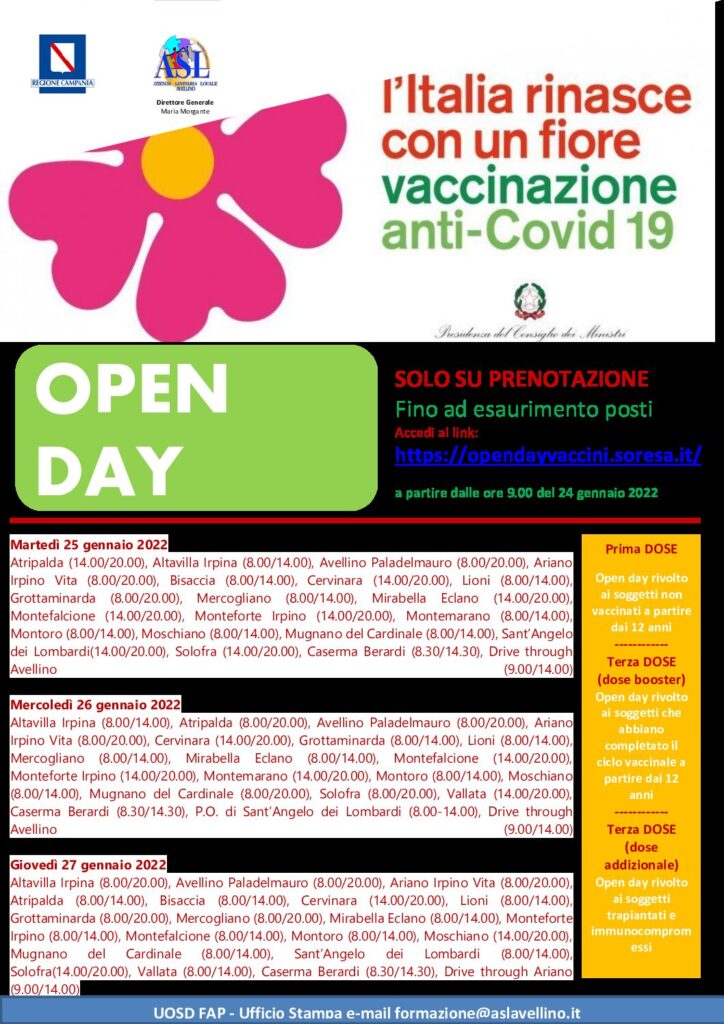Mercoledì 26 gennaio 2022 saranno attivi i Centri Vaccinali di Altavilla Irpina (8.00/14.00), Atripalda (8.00/20.00), Avellino Paladelmauro (8.00/20.00), Ariano Irpino Vita (8.00/20.00), Cervinara (14.00/20.00), Grottaminarda (8.00/14.00), Lioni (8.00/14.00), Mercogliano (8.00/14.00), Mirabella Eclano (8.00/14.00), Montefalcione (14.00/20.00), Monteforte Irpino (14.00/20.00), Montemarano (14.00/20.00), Montoro (8.00/14.00), Moschiano (8.00/14.00), Mugnano del Cardinale (8.00/20.00), Solofra (8.00/20.00), Vallata (14.00/20.00), Caserma Berardi (8.30/14.30), P.O. di Sant’Angelo dei Lombardi (8.00-14.00), Drive through Avellino (9.00/14.00)
