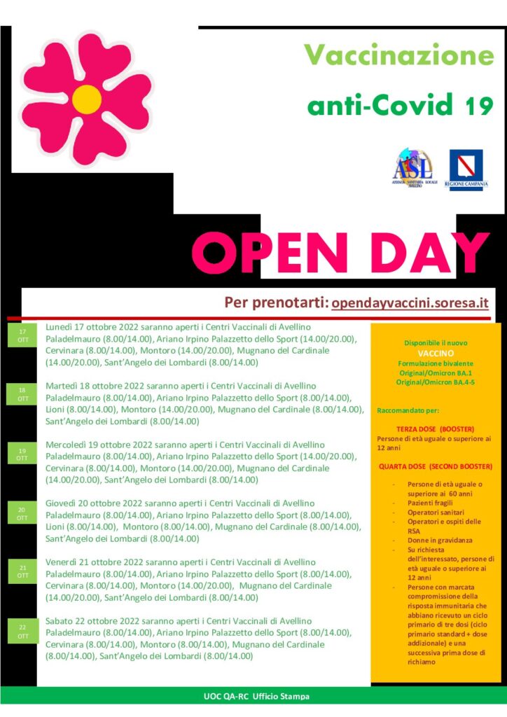 Lunedì 17 ottobre 2022 saranno aperti i Centri Vaccinali di Avellino Paladelmauro (8.00/14.00), Ariano Irpino Palazzetto dello Sport (14.00/20.00), Cervinara (8.00/14.00), Montoro (14.00/20.00), Mugnano del Cardinale (14.00/20.00), Sant’Angelo dei Lombardi (8.00/14.00)