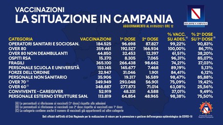 AttualitàIn EvidenzaPrimo Piano Campania: somministrate 1.713.603 dosi di vaccino Da Redazione online - 1 Maggio 2021 0 942 FacebookTwitterPinterestWhatsAppLinkedinEmail Secondo i dati dell’Unità di crisi della Regione sono state 1.713.603 le dosi somministrate ad oggi in Campania. Complessivamente con la prima dose sono stati vaccinati 1.231.013 cittadini. Di questi 482.590 hanno ricevuto la seconda dose.