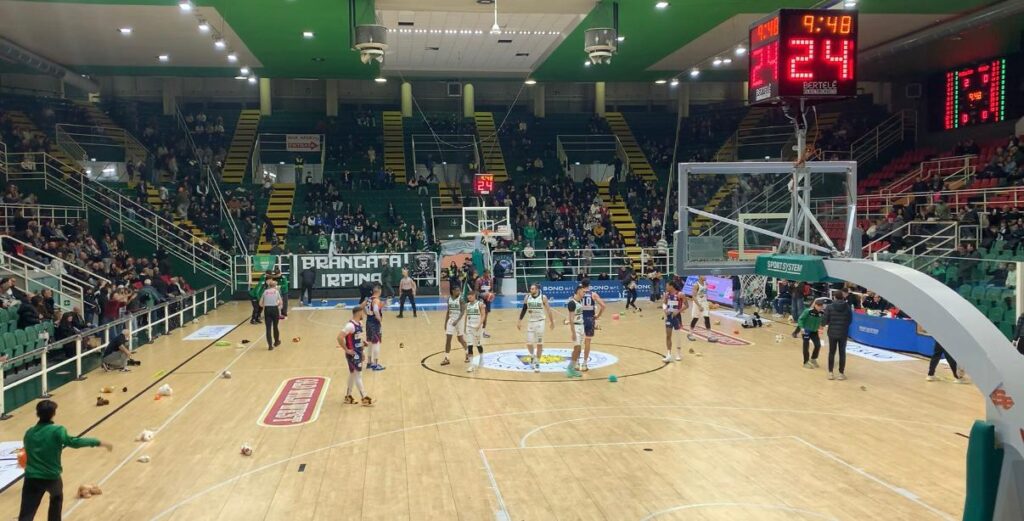 Al primo canestro su azione della gara, il parquet irpino è stato simbolicamente invaso da una pioggia di peluche: è il Teddy Bear Toss, iniziativa ormai entrata nel lessico emotivo dello sport contemporaneo, e che la società biancoverde ha scelto di abbracciare e rilanciare come atto collettivo di attenzione e cura verso l’infanzia più fragile. Un gesto semplice e potente, che ha interrotto, momentaneamente e simbolicamente, il match con decine e decine di pupazzi destinati a bambini e famiglie in difficoltà.